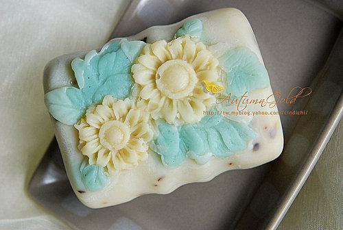 櫃子上一小瓶的桂花浸油站在那裡好幾個月,一直跟我招手...其實早就想好,要做一款簡單白淨的奶油桂花糕了,當然所謂的奶油就是乳油木果了:)。乾冷的季節正好用乳油木桂花皂洗個滋潤的熱水澡。