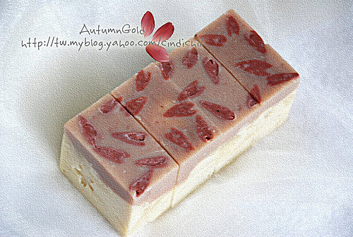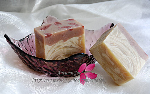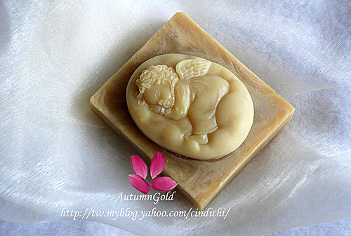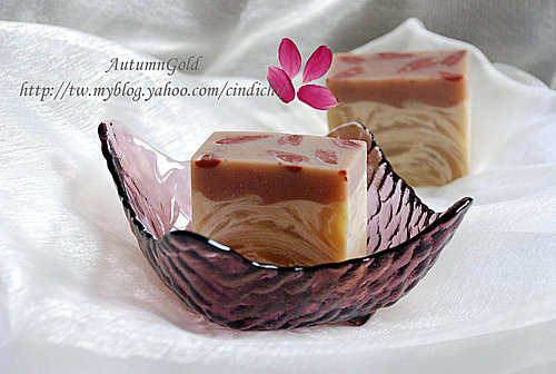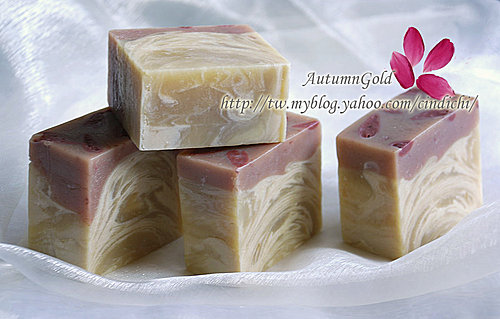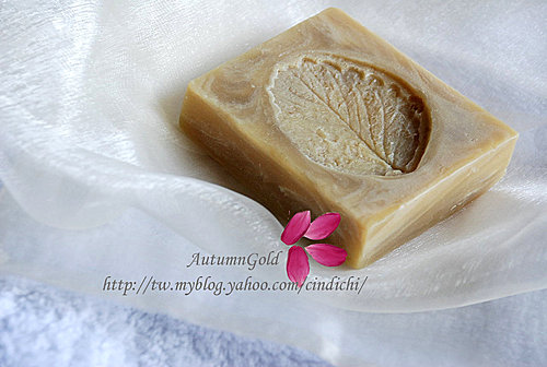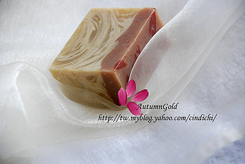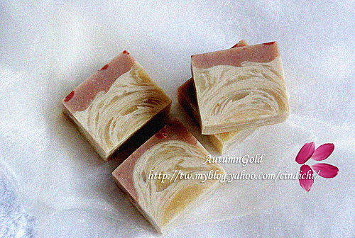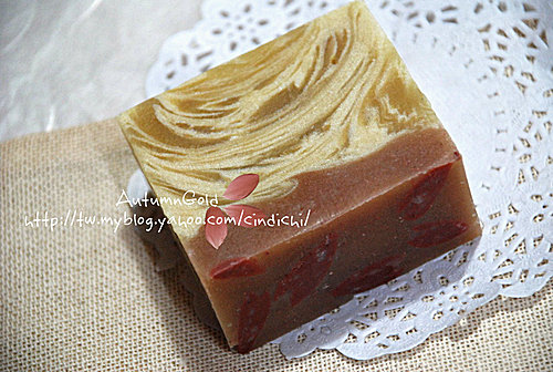 用的金盞花橄欖油同樣是Amy咪送的無價珍貴浸油,浸泡很久的金盞花油呈現漂亮的金黃色,因此讓這塊用珠光粉回鍋渲的皂體色澤澄黃澄黃的,所以偶就給它和流金畫上等號囉;至於花瓣則是仿傚日本網站的,沒有花瓣模,只能用土法捏出四不像...給各位見笑了