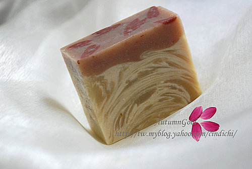 嘿嘿...這個流金就是回鍋渲染的珠光粉,有看到閃閃發亮的金光嗎?至於這個花瓣嘛就是上頭那幾片四不像的紅石泥小皂丁啦!(好心虛哦