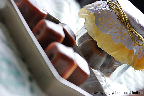 這和上一款是同一鍋做的。雖然有其他漂亮的皂模可灌,可是看到Jade這篇,讓我忍不住想拾人牙慧,所以就把剩下的可可皂液倒入類似的空塑膠零食容器中(其實早有企圖,事先收集好啦:P)。