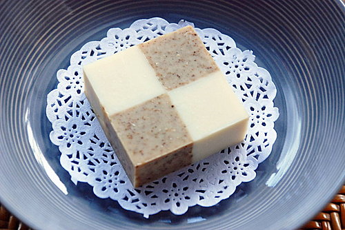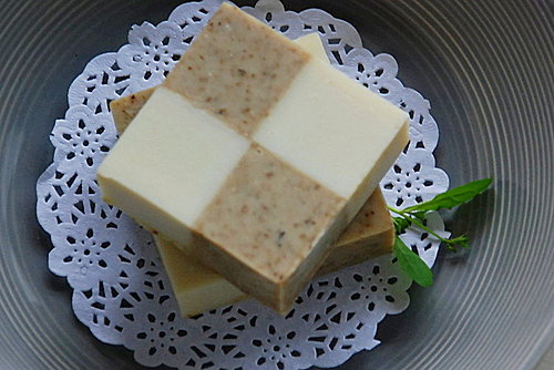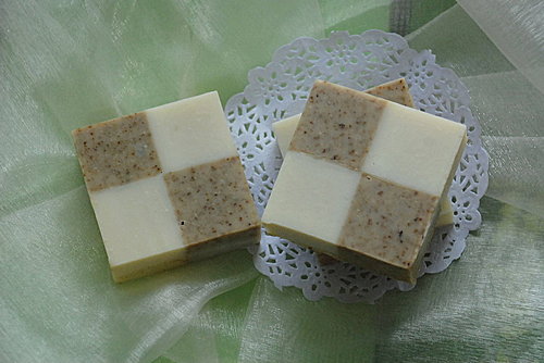 ,因為肖想模仿安妮製皂的橘色方格,嘿嘿...我早就已經預留一些薄荷泡泡皂塊來配色了。又因為不太習慣草本暗沉的色調,所以這種棋盤色的配置正好可以添加一點變化。