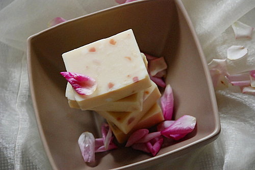 ,沒有粉紅色就像沒有花開的春天呀 >L<!著急地把一個土司模的皂液倒回鍋中,隨便灑上少許粉紅石泥攪和,然後再胡亂地倒回模子裡,這時模子底部、四周都還殘留著原色的皂液,可以想見脫模後的皂寶寶一定會膚色不均了