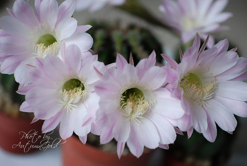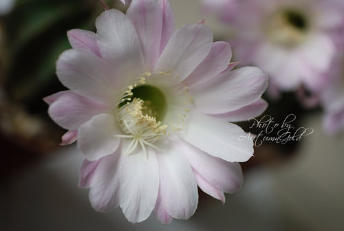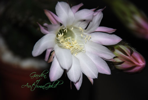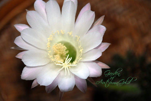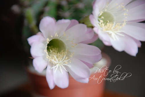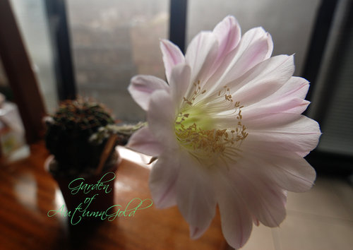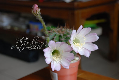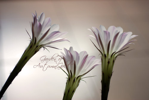 父親將它們分成好幾盆,每盆都很爭氣,綻放美麗的花朵。很喜歡她像羽毛般的花瓣,光潔雅緻。有幾分神似曇花,只是比較小,直徑大概五六公分。也帶點似有若無的香氣。